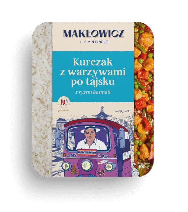 Ugotowany w punkt ryż, aromatyczny sos tajski według receptury „Makłowicz i Synowie”, starannie dobrane warzywa kipiące kolorami i idealne kawałki dobrze przyprawionego kurczaka. Ta kombinacja zamienia sklepową półkę w tradycyjne tajskie stoisko zainstalowane na motocyklu!